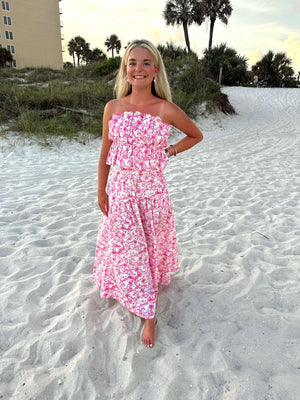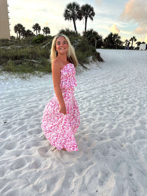 Looking for a playful beach look? Check out the Ashley Set - a 2 piece pink floral ensemble. Perfect for your next beach adventure, this set combines fun floral patterns with a quirky, carefree attitude. Don't miss out on this unique addition to your wardrobe!